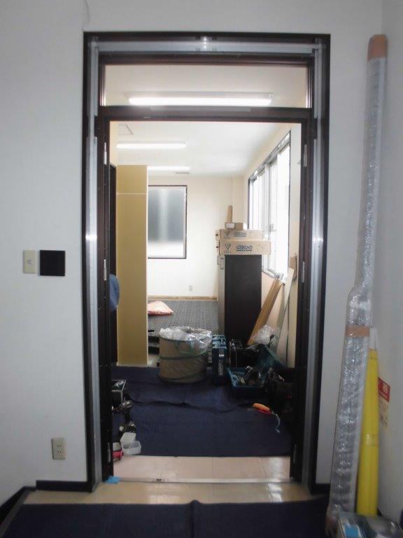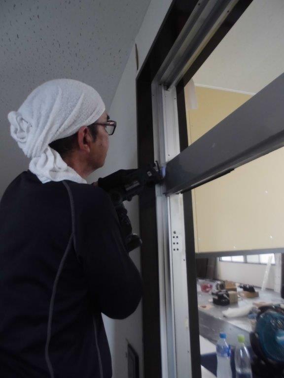 施工中① 既存シルバー色ドア本体を取り外し、その後、ランマ部硝子も取り外し、無目枠をレシプロソーで切断していきます。