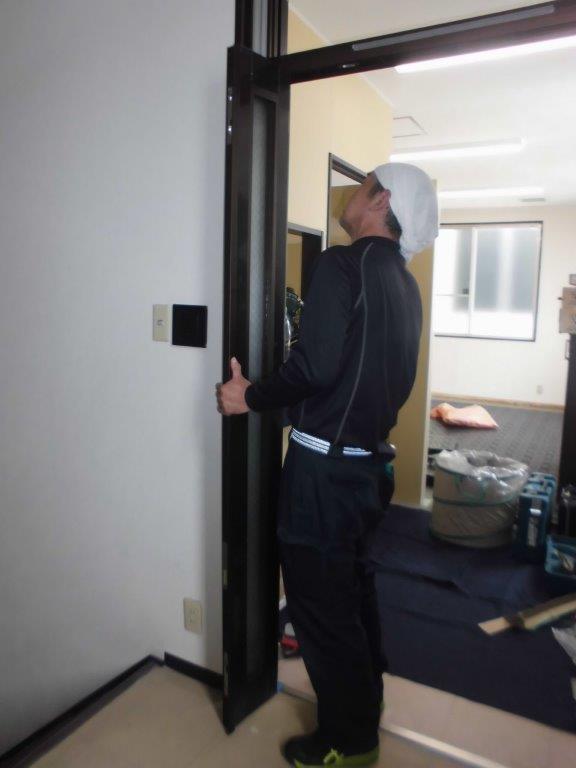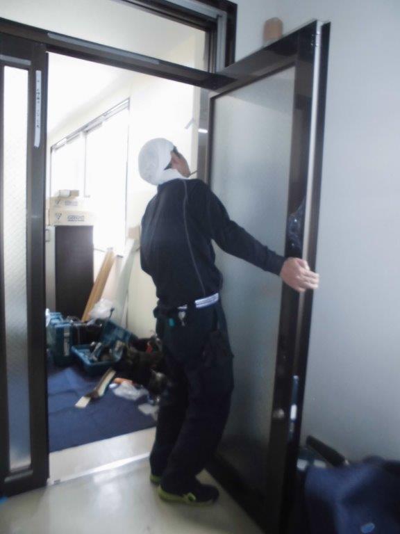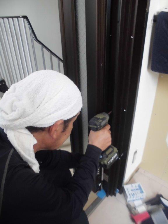 施工中⑤ 新設枠のビス止めが全て完了しましたら、ドア本体を吊り込みます。写真は親扉を吊り込んでいる所です。