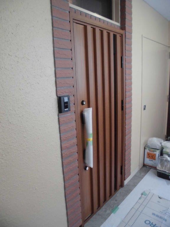 施工後 外部側からの写真です。ドアのスピード調整、施錠調整をして完成となります。カバー工法ですと1日で取付完了しますので、防犯面でも安心です。