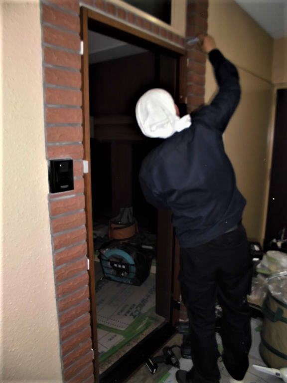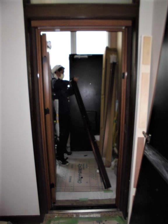施工中① 既存のドア本体を取り外し、事前に採寸オーダー製作した、新設玄関ドア枠をはめ込みます。