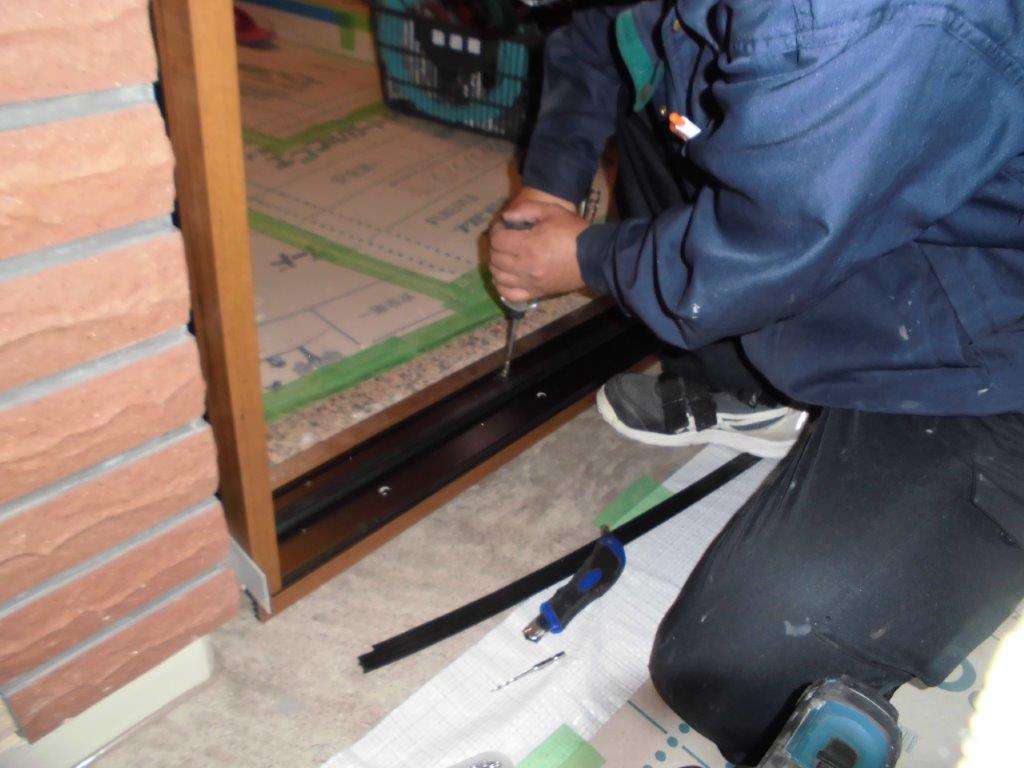 施工中⑤ 外額縁を新設枠にビス止めして行きます。