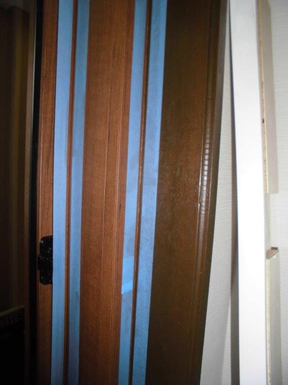 施工中⑥ 内部側の既存枠と新設枠との隙間をコーティング処理をしていきます。写真はコーキン材がはみ出さず、美しく仕上がる様にマスキングテープを貼っている所です。