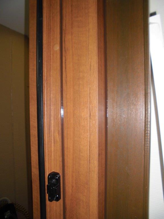 施工前 ご自宅マンション玄関ドアです。大規模改修工事に伴い、木目調断熱タイプ、プッシュプル錠に取替する事となります。既存のドア枠を残したままの、カバー工法での取替です。