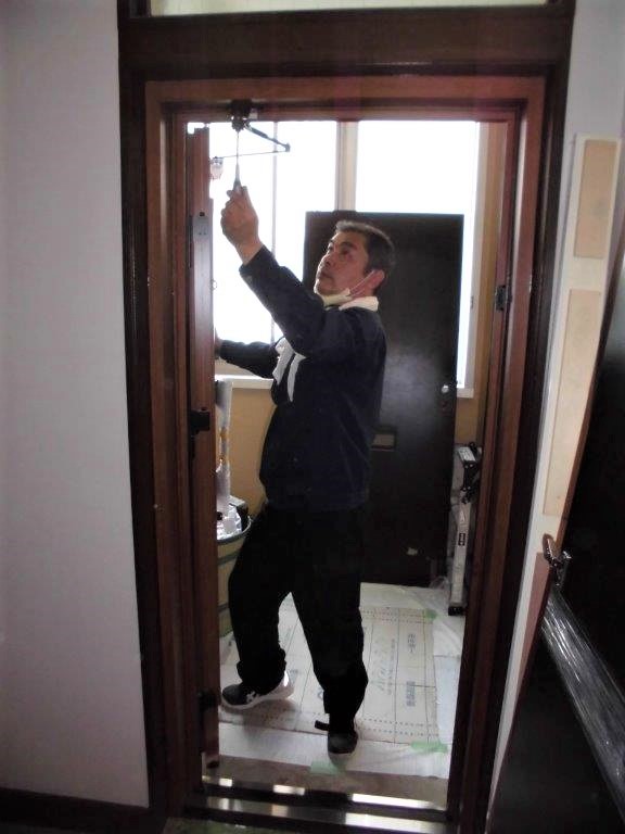 施工中⑧ ドア本体のストップ位置をドアクローザーで調整しています。