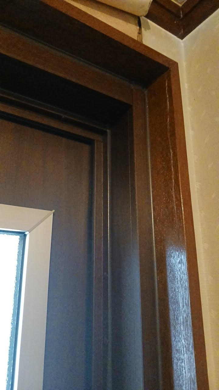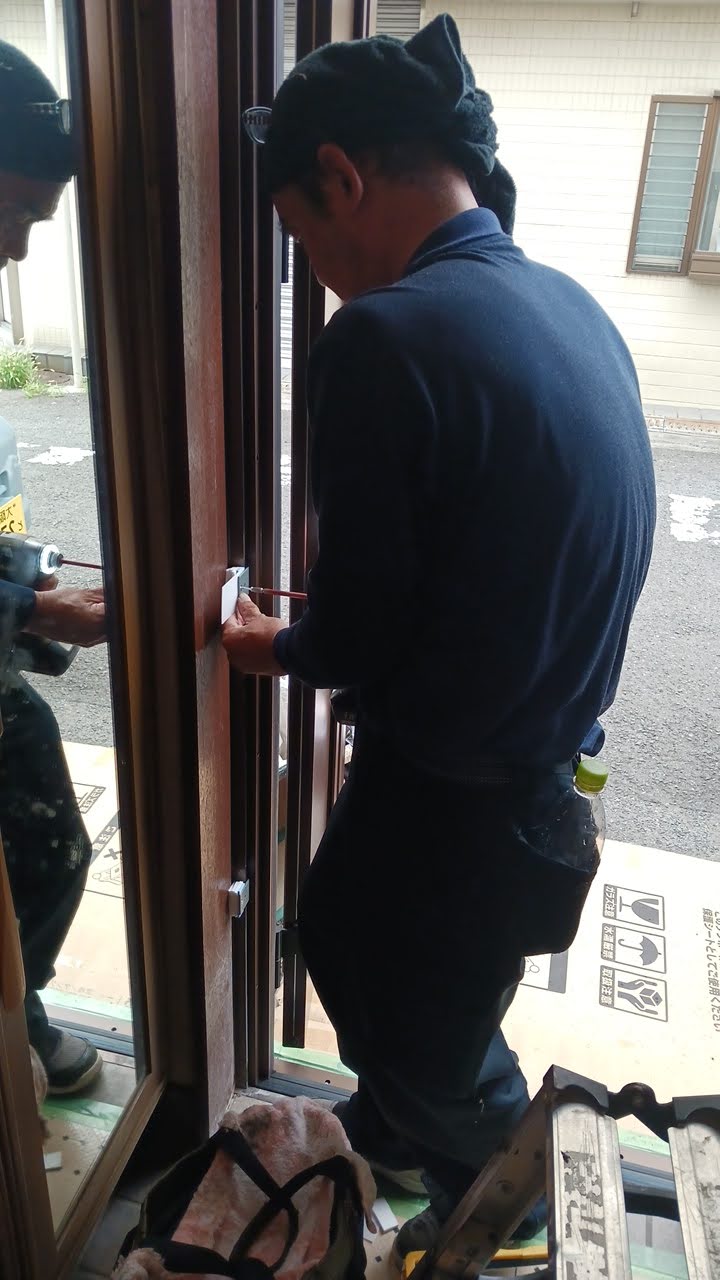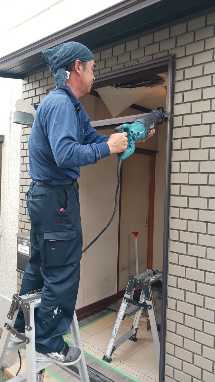 こちらは施工中の写真になります。ドアリモは、既存枠の中に新しい枠をお取り付けするカバー工法という施工法で玄関ドアをお取替えします。今回は、既存の玄関ドアがランマ付きだった為、ランマの無目をカット致しました。