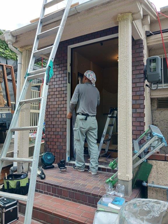 こちらは施工中の写真です。カバー工法は、既存の枠の中に新しい枠を取り付ける施工方法です。外壁や内装を傷めないので、玄関ドアのお取替えが1日で完了します!!