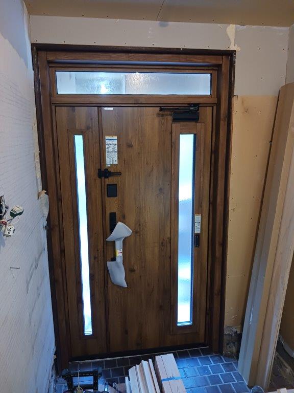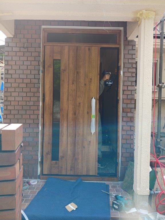 ドア枠が取付出来たら、アルミのカバー材を内部、外部ともに取り付けていきます。このカバー材を取り付けることで、既存のドア枠を完全に隠すことができます!新しいドアは、リモコンで鍵の施解錠できる電気錠仕様ですので、毎日の開け閉めが快適です!玄関ドアのお悩みは、ぜひ弊社にご相談下さい!お見積もり、現場調査は無料です!!