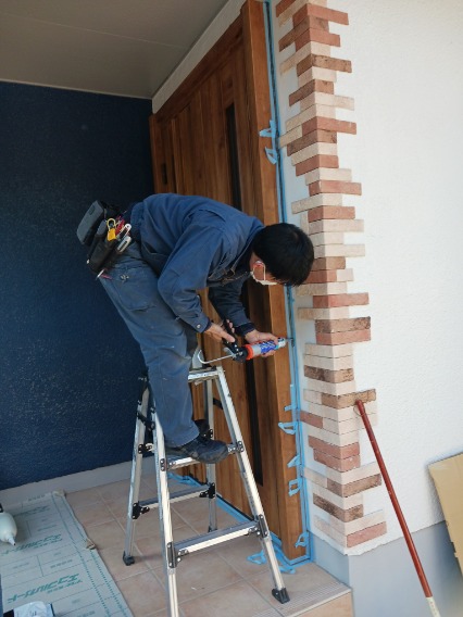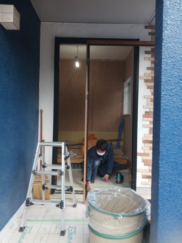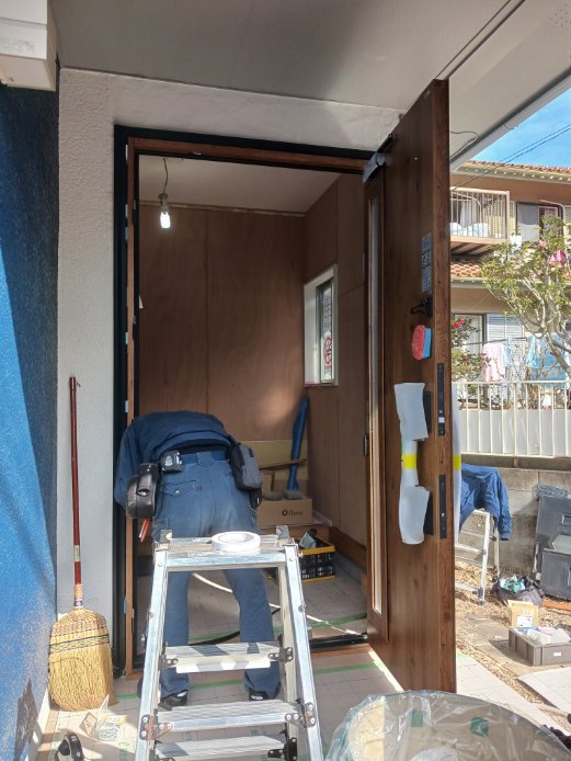 こちらは施工中の写真になります。ドアリモはリフォーム用の玄関ドアでカバー工法という施工方法で玄関ドアをお取替えします。カバー工法は、外壁や内装を傷めずに玄関ドアのお取替えができます!その為、1日で玄関ドアのお取替えが可能なのです。