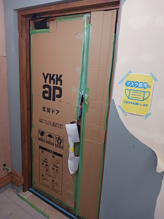 今回は、その他のリフォーム工事があった為、最後にドアを傷防止で養生して作業完了致しました。この時点で夕方頃です。玄関ドアのお悩みは、ぜひ弊社にご相談下さい!お見積もり、現場調査は無料です!!