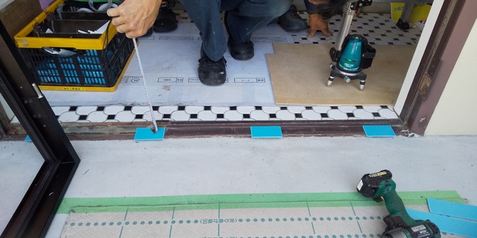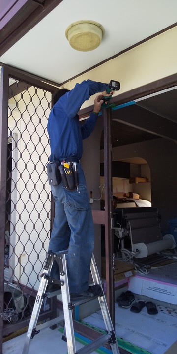 新しい枠を固定する際には、水平、垂直に狂いがないように確認しながら取り付けていきます。
