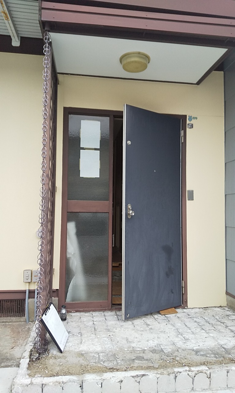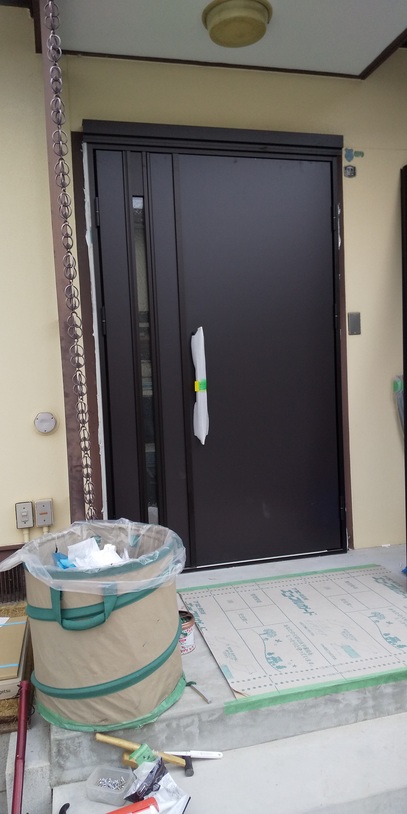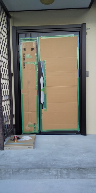 今回は、リフォーム工事の途中で玄関ドアの取替を行った為、ドアを養生して終了しました。