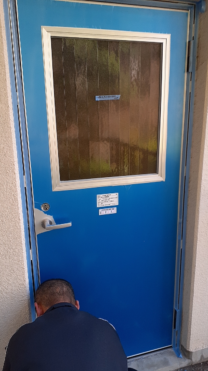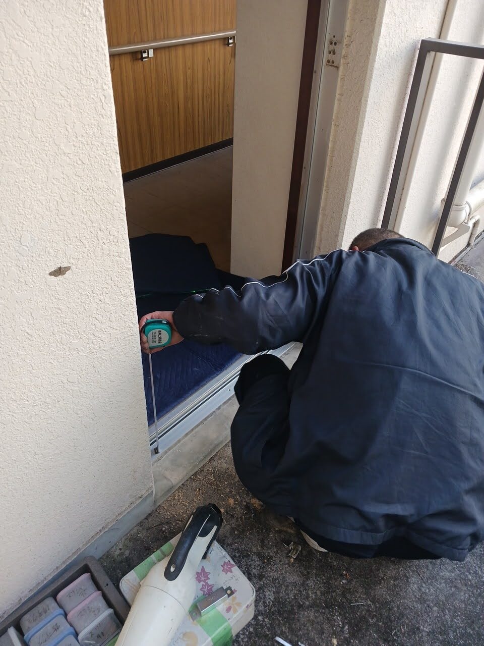 開閉に問題がなければ、枠回りをコーキング処理していきます。この処理をすることで、ドアからの雨漏りを防ぎ、気密性を向上させています。新しいドアはレバーハンドル錠を採用致しましたので、開閉も楽にできると思います。アルミドアのお悩みは、ぜひ弊社にご相談下さい!お見積もり、現場調査は無料です!!