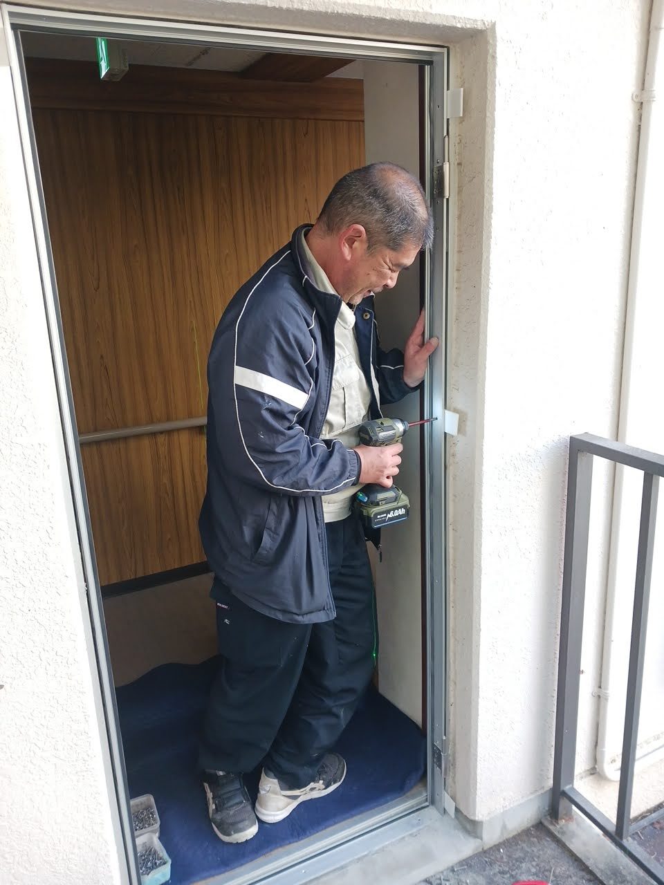 新しい枠をビスで取り付けていきます。枠の取付が終わったら、ドア本体を吊り込んで開閉確認を行います。