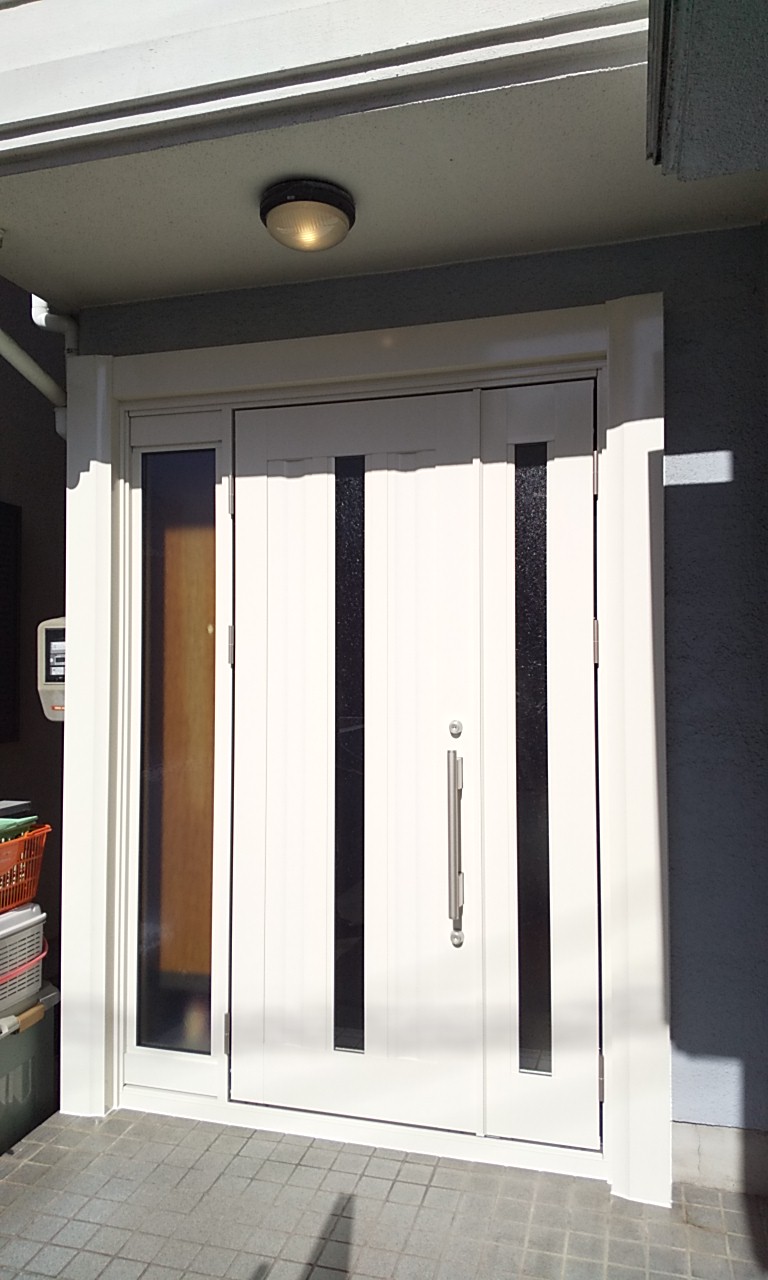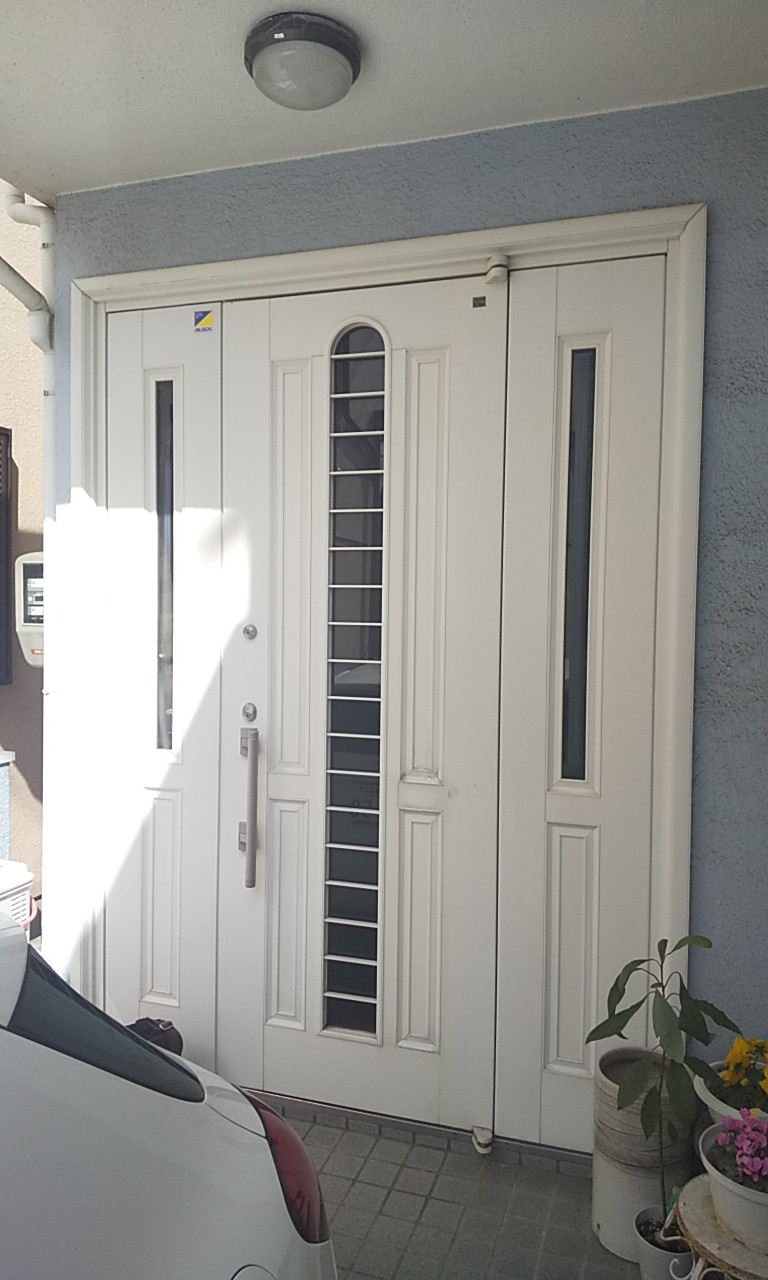 本日ご紹介するのは、先日お伺いしたリフォーム玄関お取付けの現場です。お客様から「ドアの表面の塗装が傷んだので、取り替えたい。」とご要望を頂きました。既存は両袖片開きの玄関ドアでした。