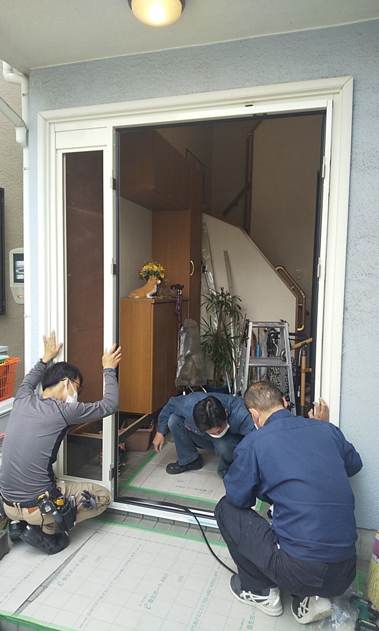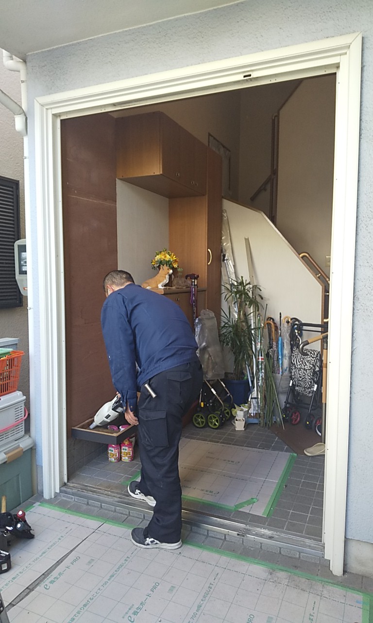 こちらは、施工中の写真です。まずは既存のドア、両袖のユニットを取り外します。今回は造り付けの靴箱も外さないと作業できなかった為、靴箱のユニットも一旦取り外しました。