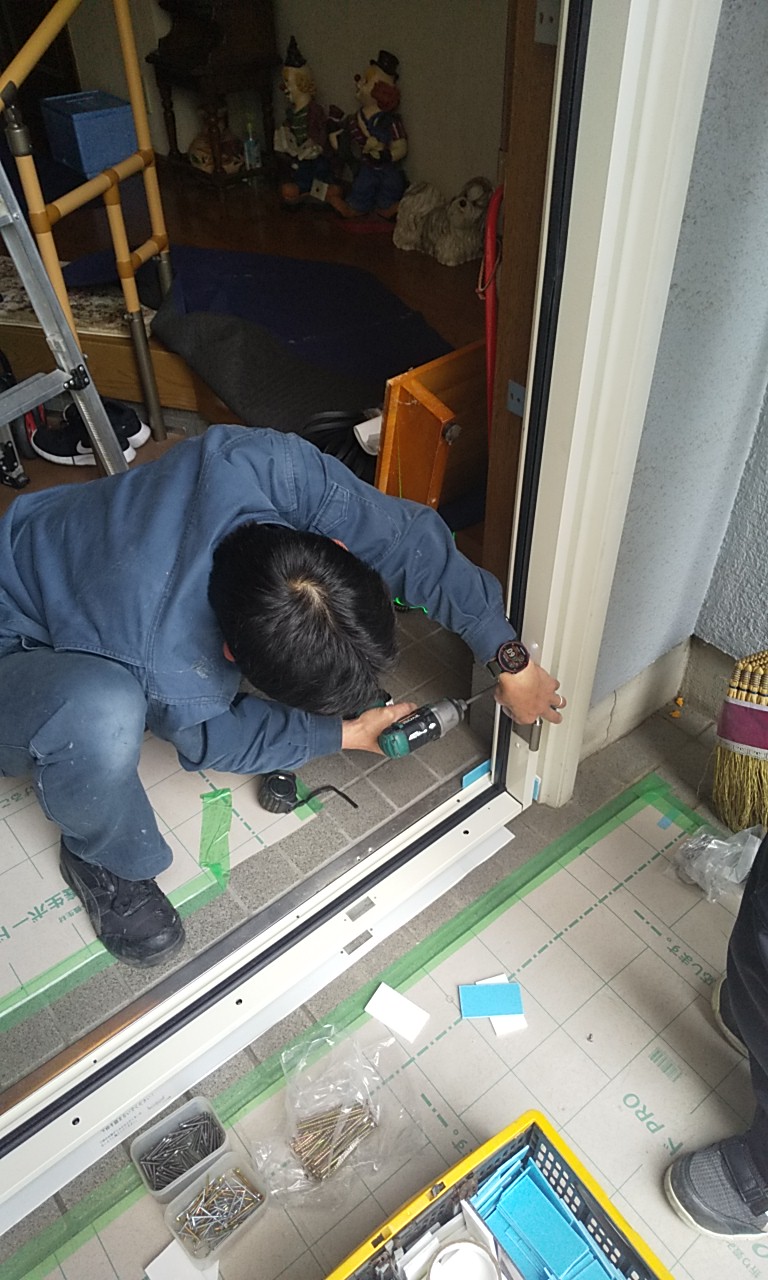 邪魔な物が無くなったら、新しい枠を固定していきます。この時、枠に歪みが無いように水平、垂直を確認しながら取り付けていきます。