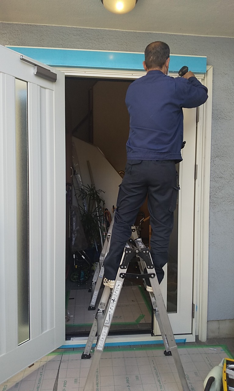 カバー材は内部と外部両方ありますので、中から見ても古い枠は見えません。最後にドアの開閉、鍵の施錠を確認したら完成です!!玄関ドアのお悩みはぜひ弊社にご相談下さい!!お見積もり、現場調査は無料です!!