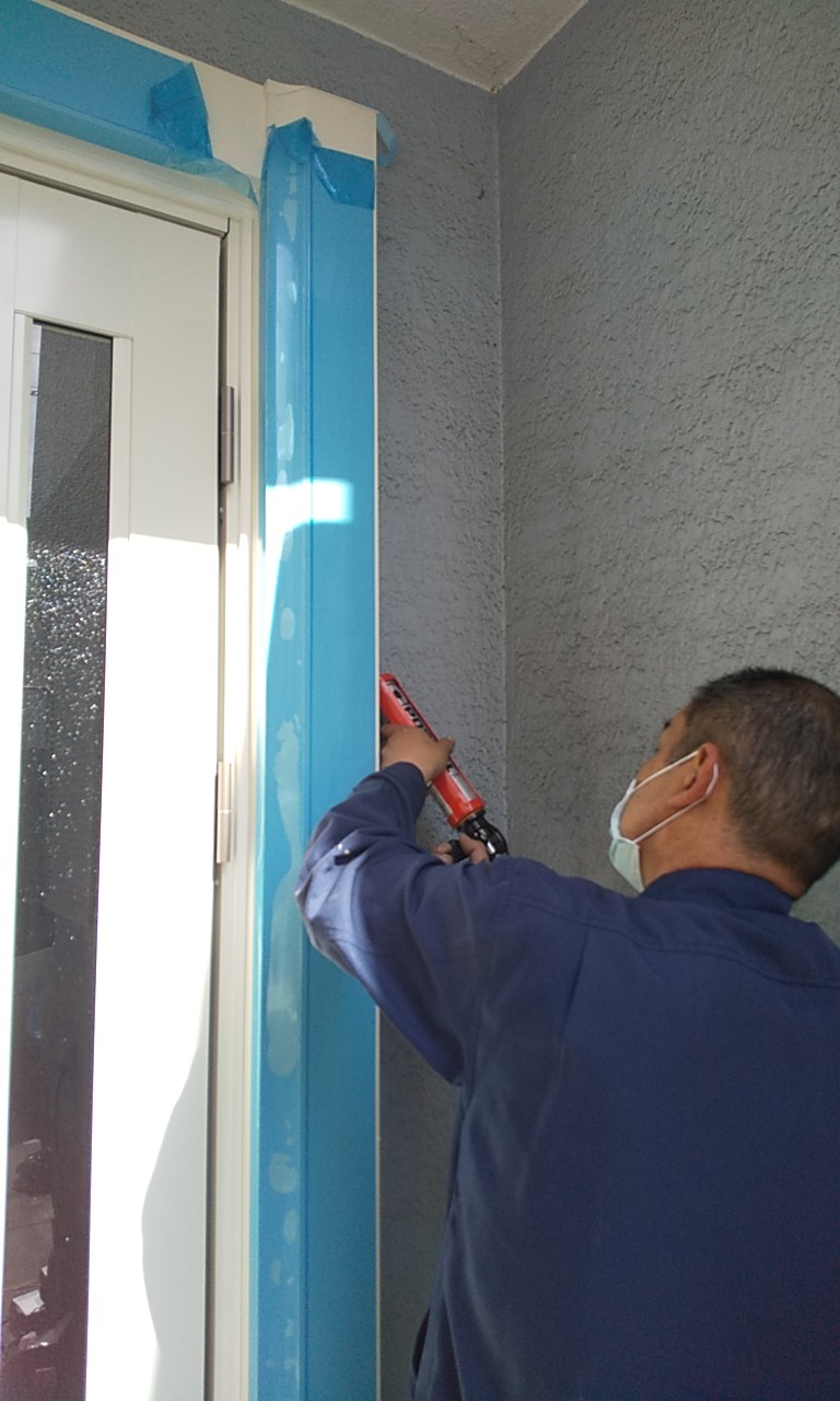 カバー材が固定出来たら、外壁との取り合いをコーキング処理していきます。既存枠と新しい枠との間とカバー材と外壁との間で2重にコーキング処理をして気密性を高めます。