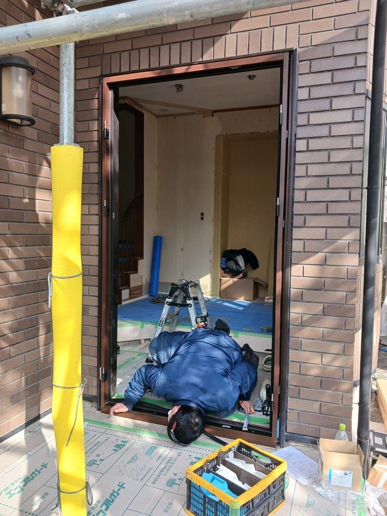 こちらはドアリモの施工中の写真になります。ドアリモはカバー工法という施工方法で、玄関ドアをお取替えします。カバー工法は既存の玄関枠を取り外さずに玄関ドアのお取替えが出来ますので、施工が1日で完了します。まずは既存のドア本体、金物等邪魔になる物を撤去致します。