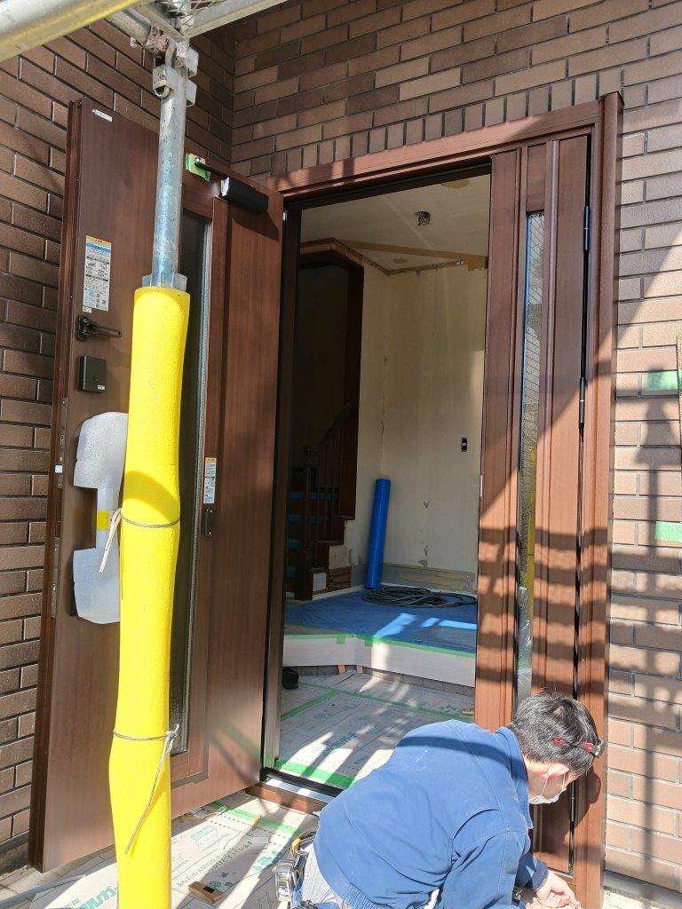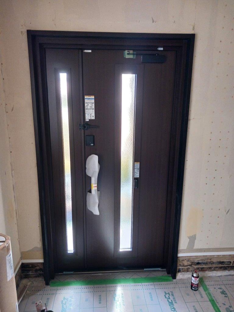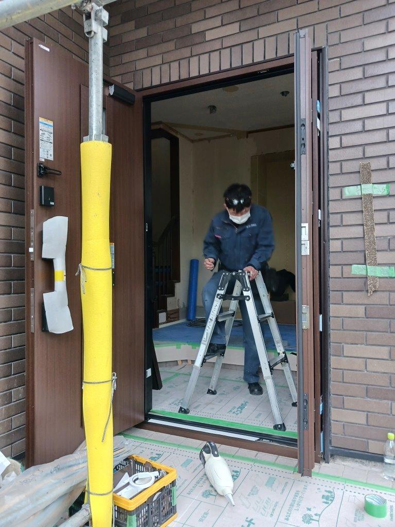 内部側にもアルミのカバー材を取り付けます。最後に枠周りをコーキング処理すれば、完了です。今回は、電池式の電気錠もご採用頂きましたので、リモコンで鍵の掛け閉めが出来るドアになりました!玄関ドアのお悩みはぜひ弊社にご相談下さい!お見積もり、現場調査は無料です!!
