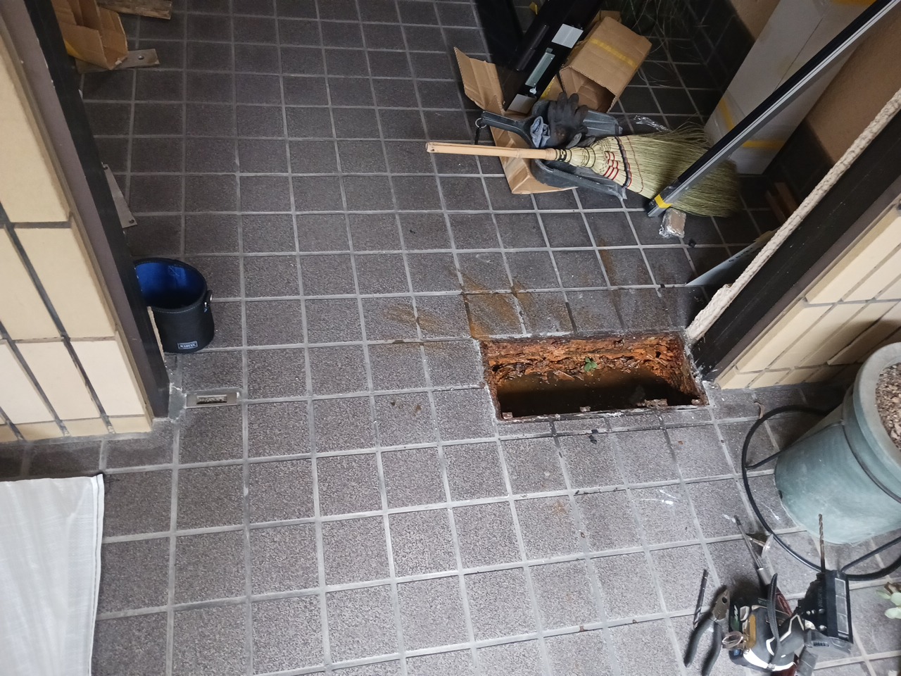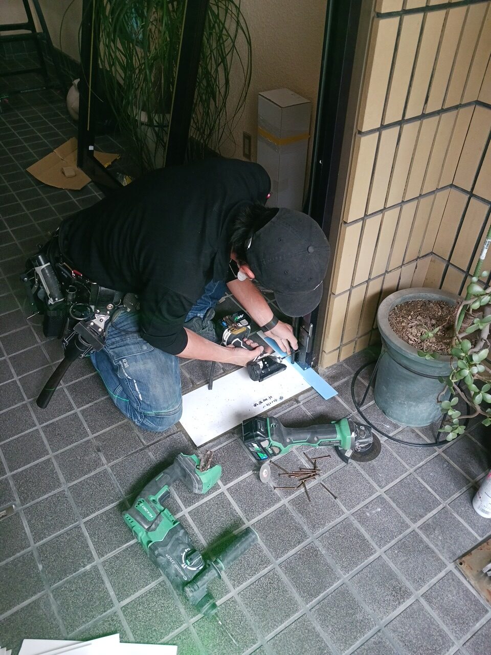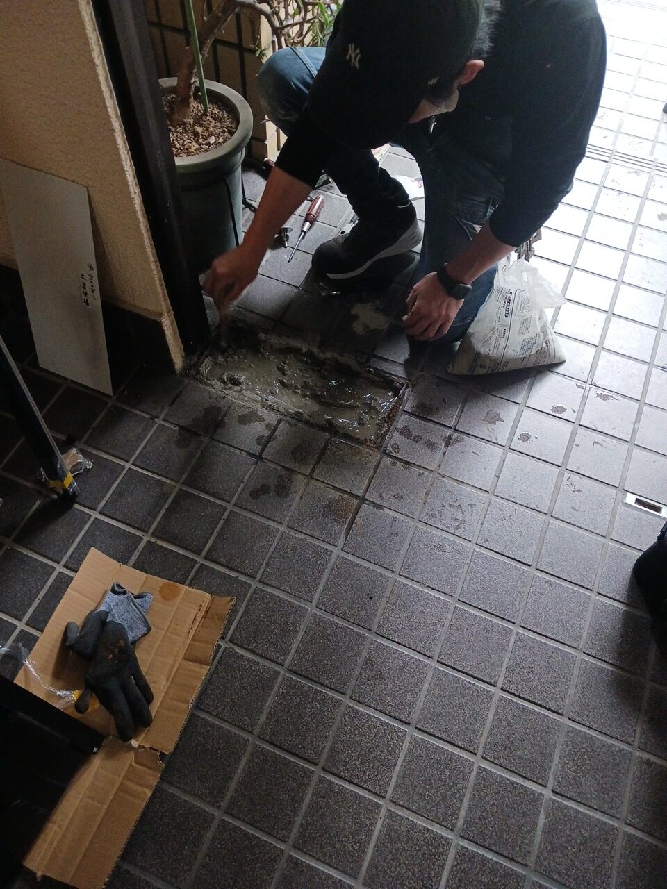 こちらは施工中の写真になります。まずは、既存のドアを取り外します。テンパードアで幅も大きかった為、かなり重かったです!!職人さんでもトラックに積むのに一苦労でした。ドアが外せたら、吊元の地面に埋まっているフロアヒンジを撤去します。