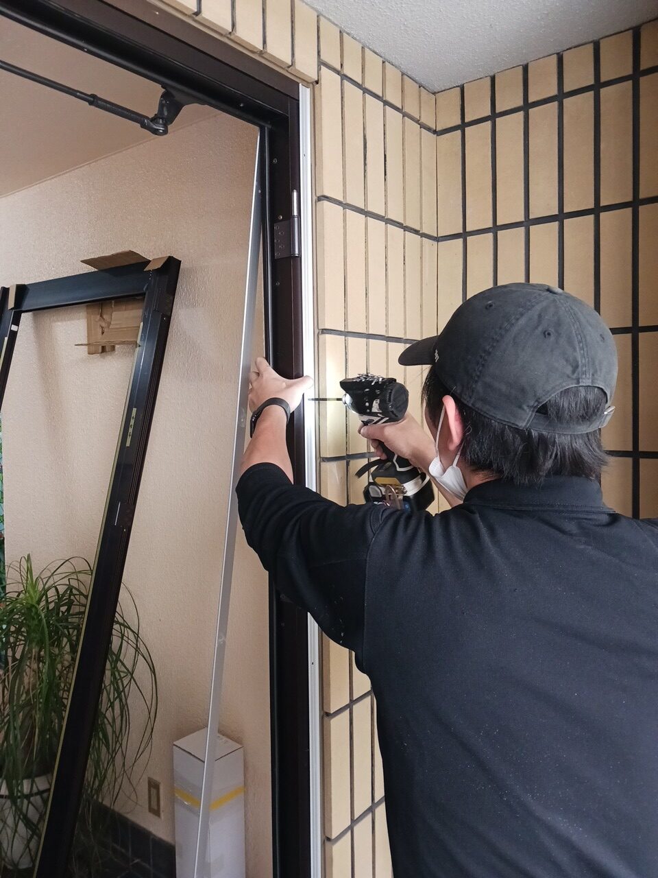 新しい枠を既存枠に取付に取り付けていきます。この時、水平、垂直を確認して枠に歪みがないように取り付けます。カバー工事は、既存枠を残したまま、ドアのお取替えが出来るので、価格もリーズナブルです!!