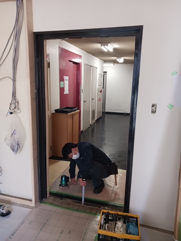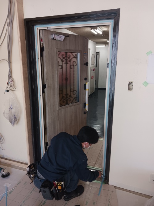 こちらは施工中の写真です。既存枠の中に新しい枠を固定していきますが、この時枠に歪みが無いように、水平、垂直を確認しながら取り付けていきます。