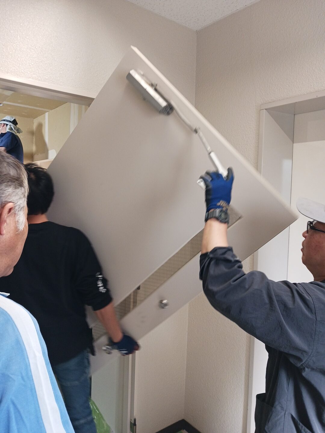 スチールドアはかなり重量がありますので、2人がかりで作業します。
