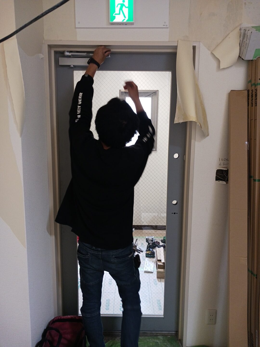 新しい扉を吊り込んで、ドアクローザー、レバーハンドル錠を取り付けていきます。