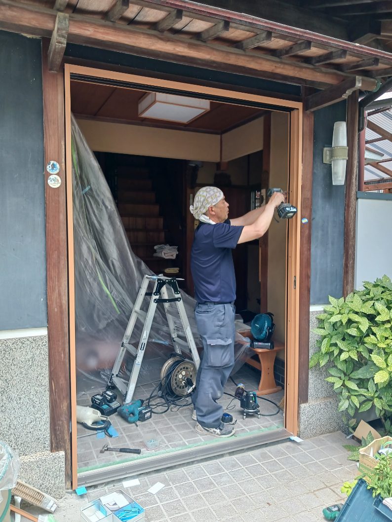 こちらは施工中の写真になります。今回は既存がランマ付きの引き違いだった為、既存の無目を撤去致しました。ドアリモはカバー工法という施工方法で玄関引き戸をお取替えします。カバー工法は既存枠の中に新しい枠を取り付ける、施工方法です。
