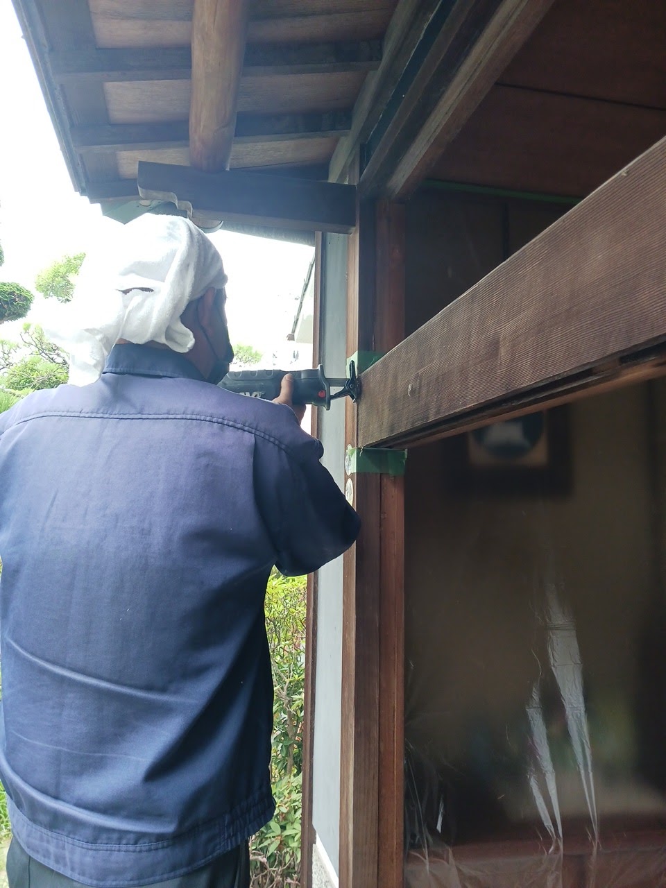枠が固定出来たら、既存枠と新しい枠との間をコーキング処理していきます。この処理をすることで、サッシからの雨漏れを防ぎ、気密性を上げています。最後にアルミのカバー材を取り付ければ完成です。