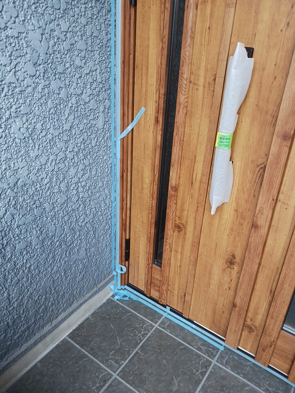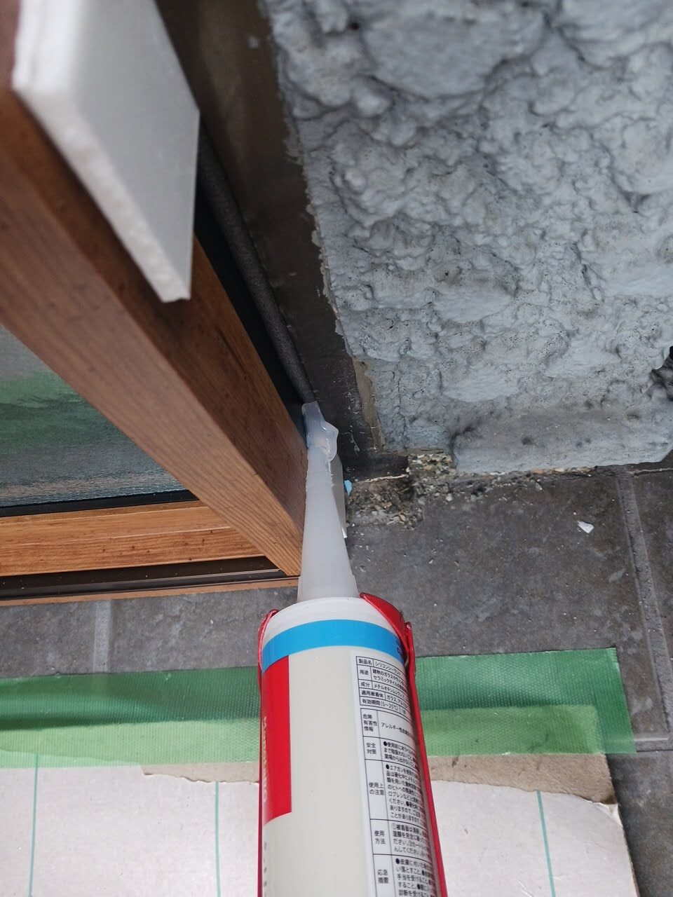 枠の固定でができたら、既存枠と新設枠の間をコーキング処理していきます。この処理をすることで、玄関からの雨漏りを防ぎ、気密性を向上させています。