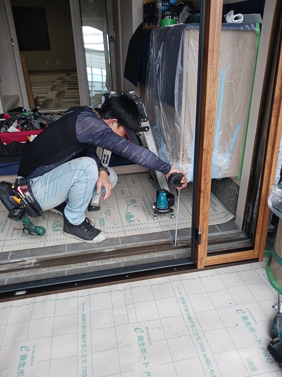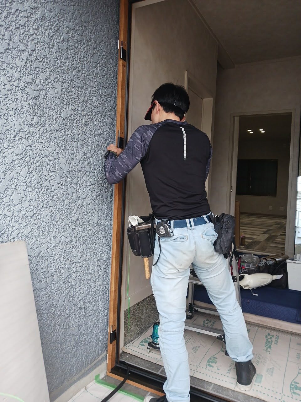 新しい枠を取り付ける時には、枠に歪みがないように水平、垂直をを確認しながら取り付けていきます。