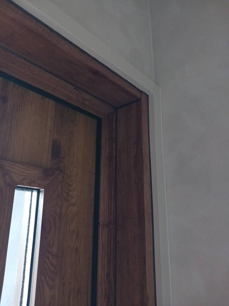 外部もカバー材を取り付け終わったら、外壁とカバー材の取り合いをコーキング処理していきます。元の玄関枠が全く見えなくなる為、仕上がりは新築同様です!