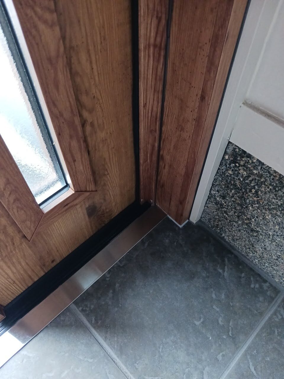 土間と新設枠に段差ができる場合は、段差緩衝材を張り付けてスロープ形状にすることで、つまずきにくく仕上げます。玄関ドアのお悩みは、ぜひ弊社にご相談下さい!お見積もり、現場調査は無料です!!