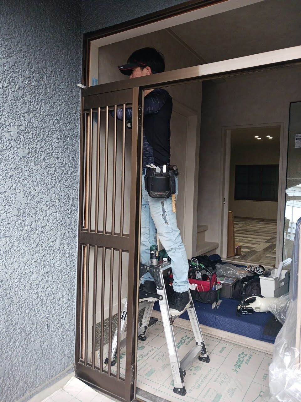 こちらは施工中の写真になります。カバー工法は既存の枠の中に新しい枠を取り付ける施工方法です。今回はランマと袖があったので、邪魔になる無目と方立を撤去します。