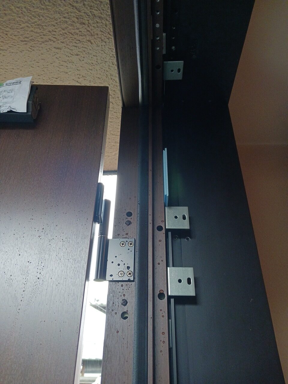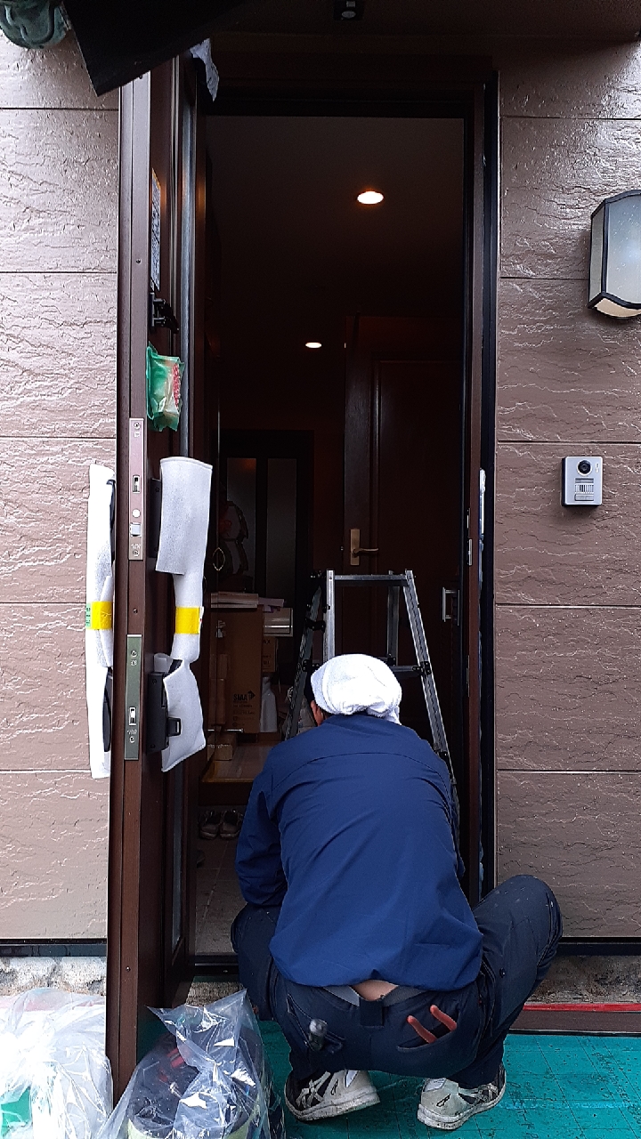 こちらは施工中の写真になります。ドアリモはカバー工事という施工方法で玄関ドアをお取替えします。カバー工事は既存枠を残して、その中に新しいドア枠を取り付ける施工方法です。