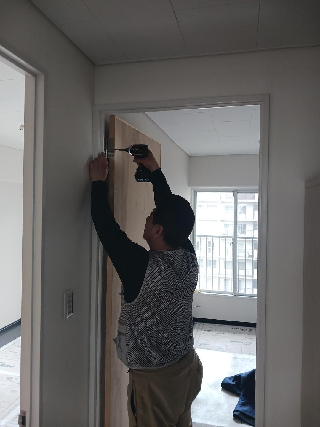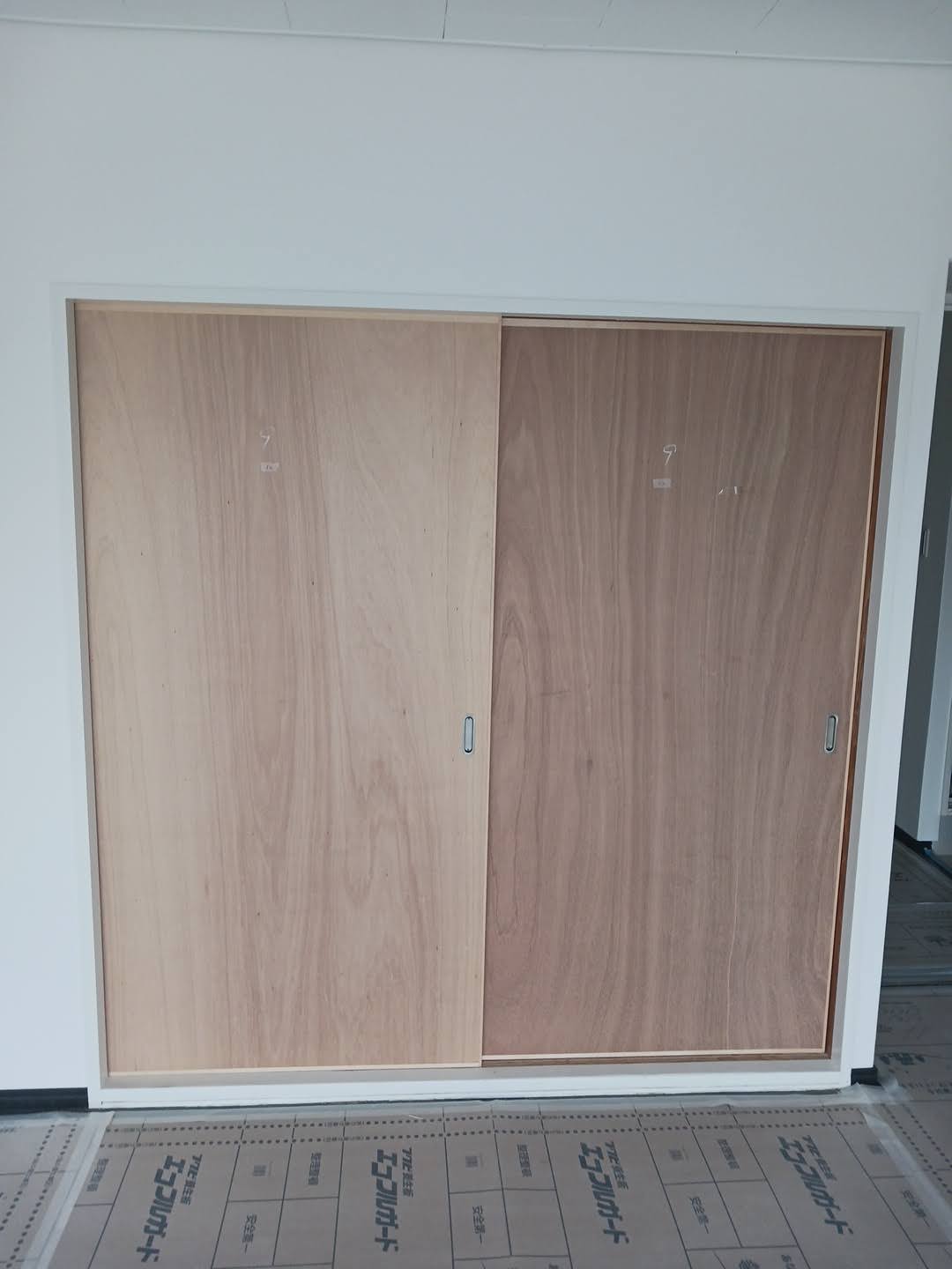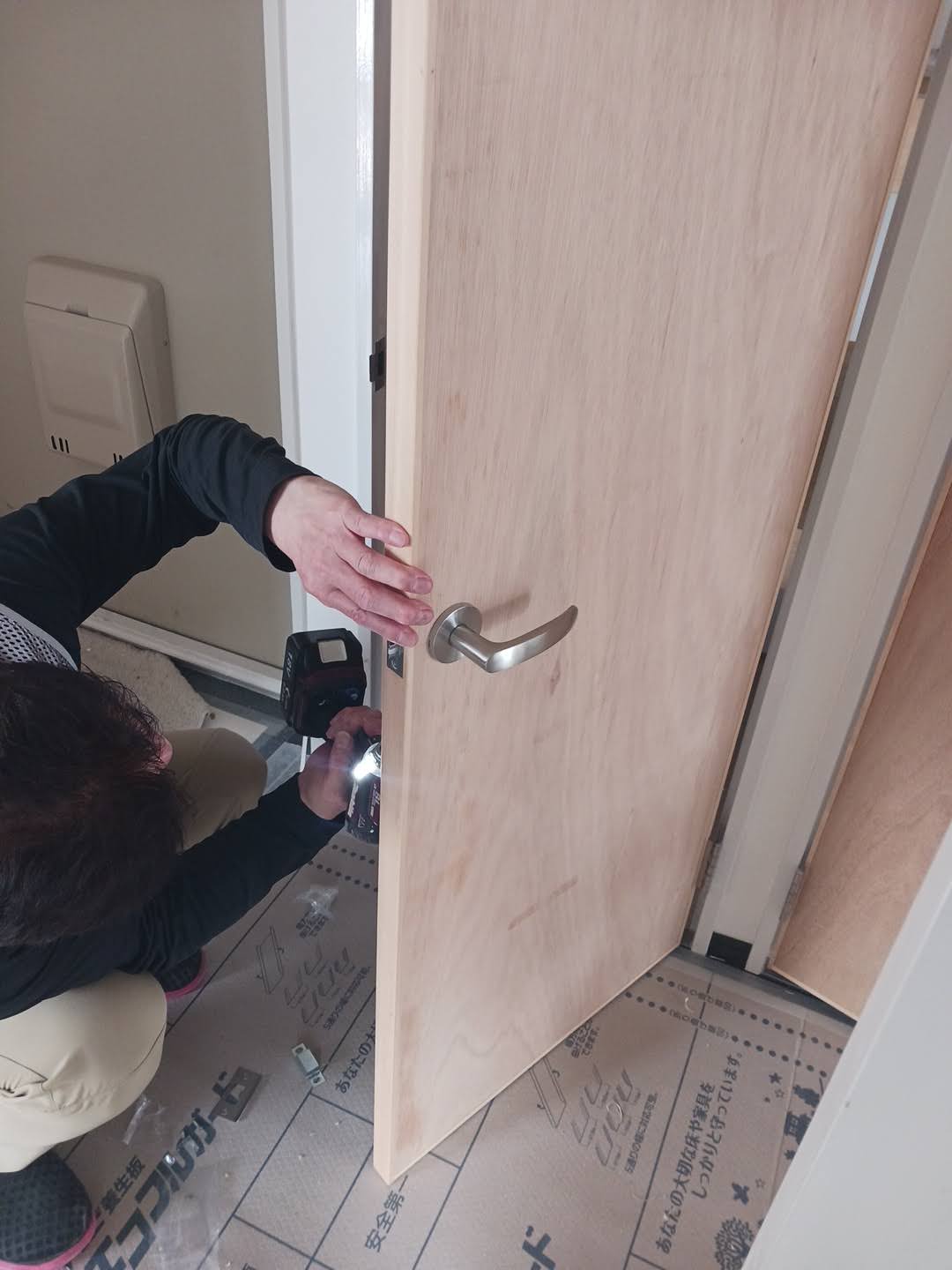 建具を吊り込んだ後にクロス屋さんが扉にクロスを貼って完成です。