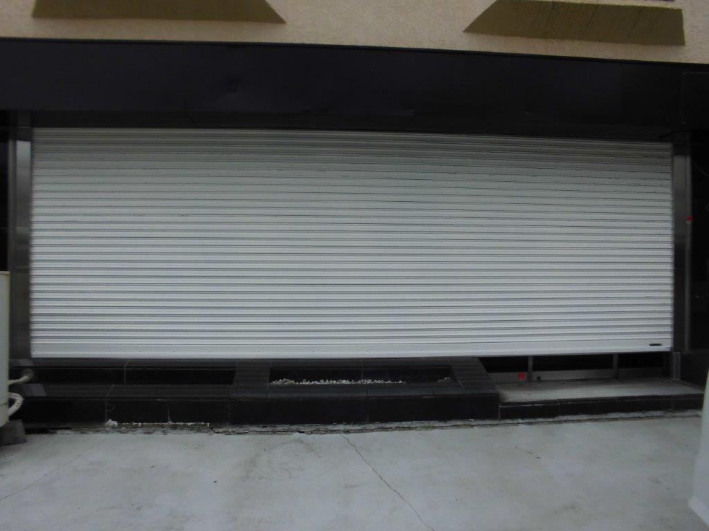 完成写真です。幅6.6M H2.2Mの重量シャッターが取付完了後、スラットをホワイトに塗装し綺麗に仕上がりました。ボタン操作で以前より静かに開閉することが可能になりました。