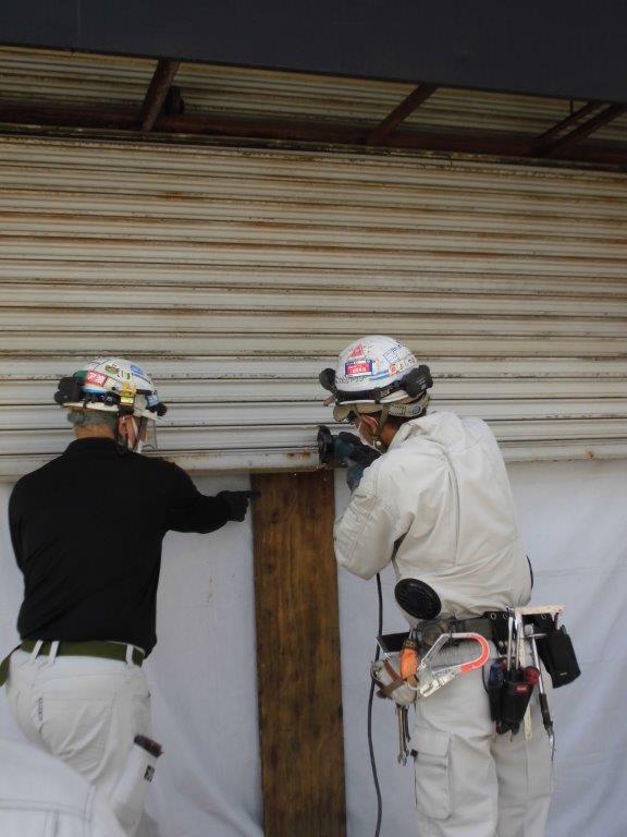 施工中① 既存シャッターのスラット部を2M位ずつグラインダーで切断して、順番に取り外して行きます。