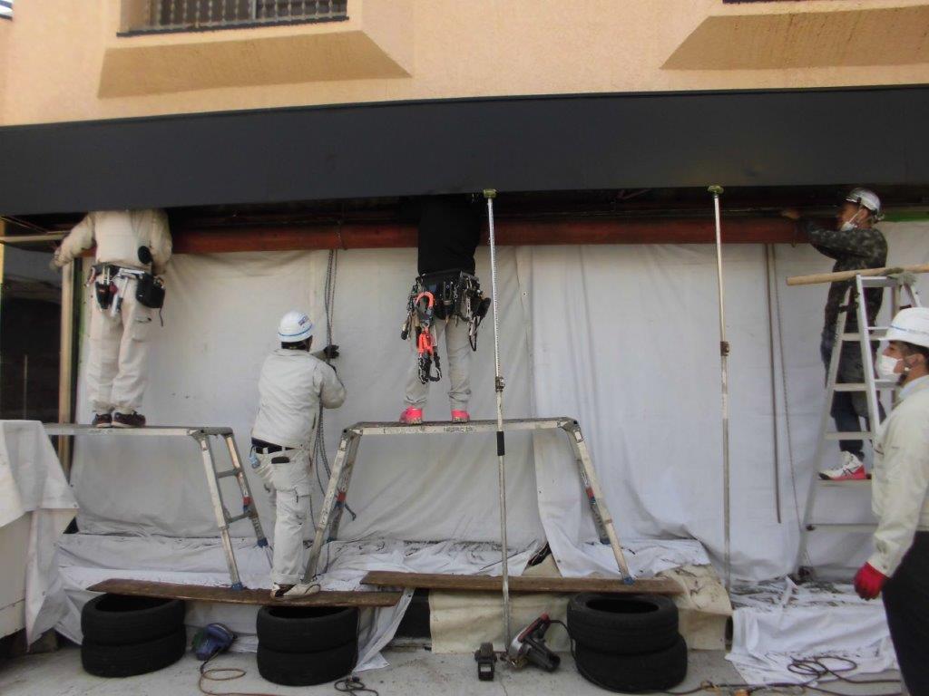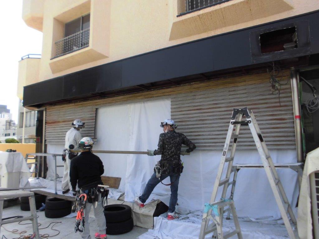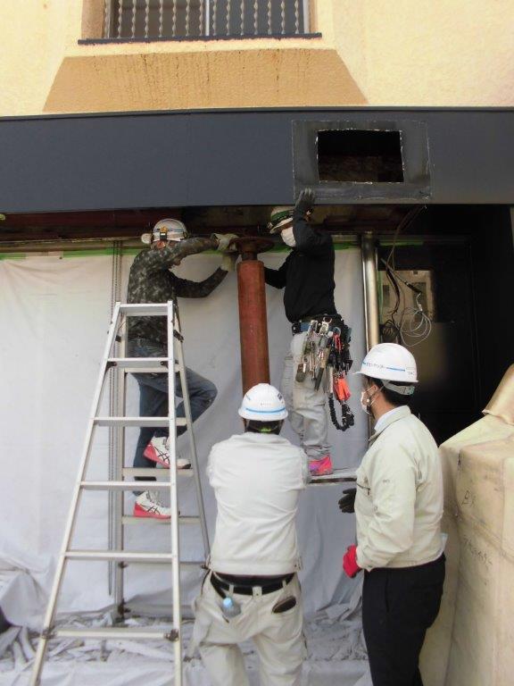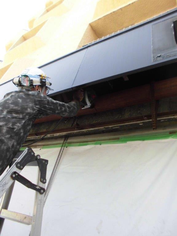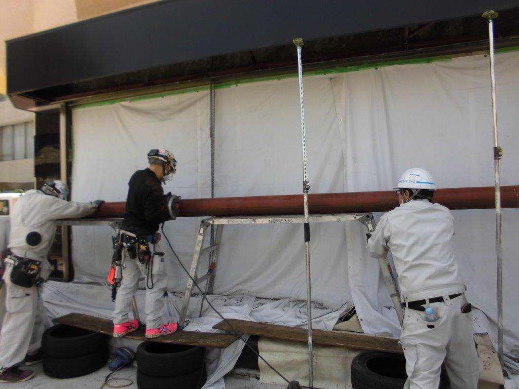 施工中⑧ 既存のシャフトとスラットの撤去完了しましたら、新設シャッターの取付をします。