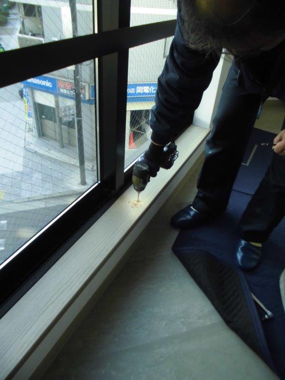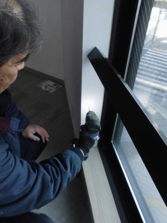 施工中①事前に採寸オーダー製作した新設クロス面格子の取付用ブラケット位置を計測し、電動インパクトドライバーに穴開け用3.5mm のキリを装着、下部に仮穴を開けています。