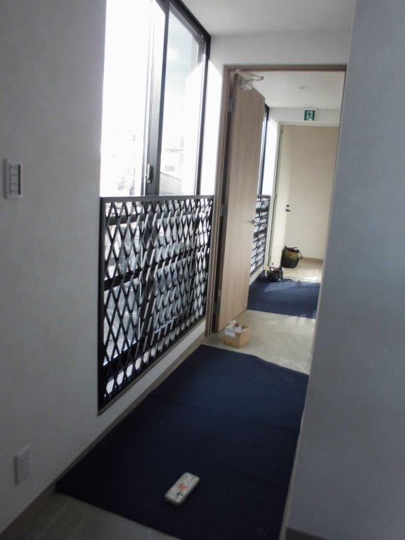 施工後 既存スチールL字手摺を残し、床から1.2m程の高さ迄、クロス面格子をしっかりと取付しました。