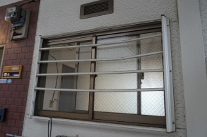 吹田市 防犯対策で1F雨戸付窓1カ所、出窓2カ所、計3カ所アルミ縦面格子取付を取付しました。