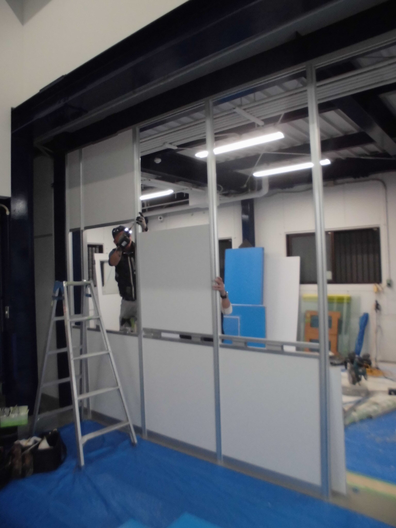 施工中⑧壁パネルを順番にはめ込んでいる所です。真ん中面は透明の硝子が入ります。
