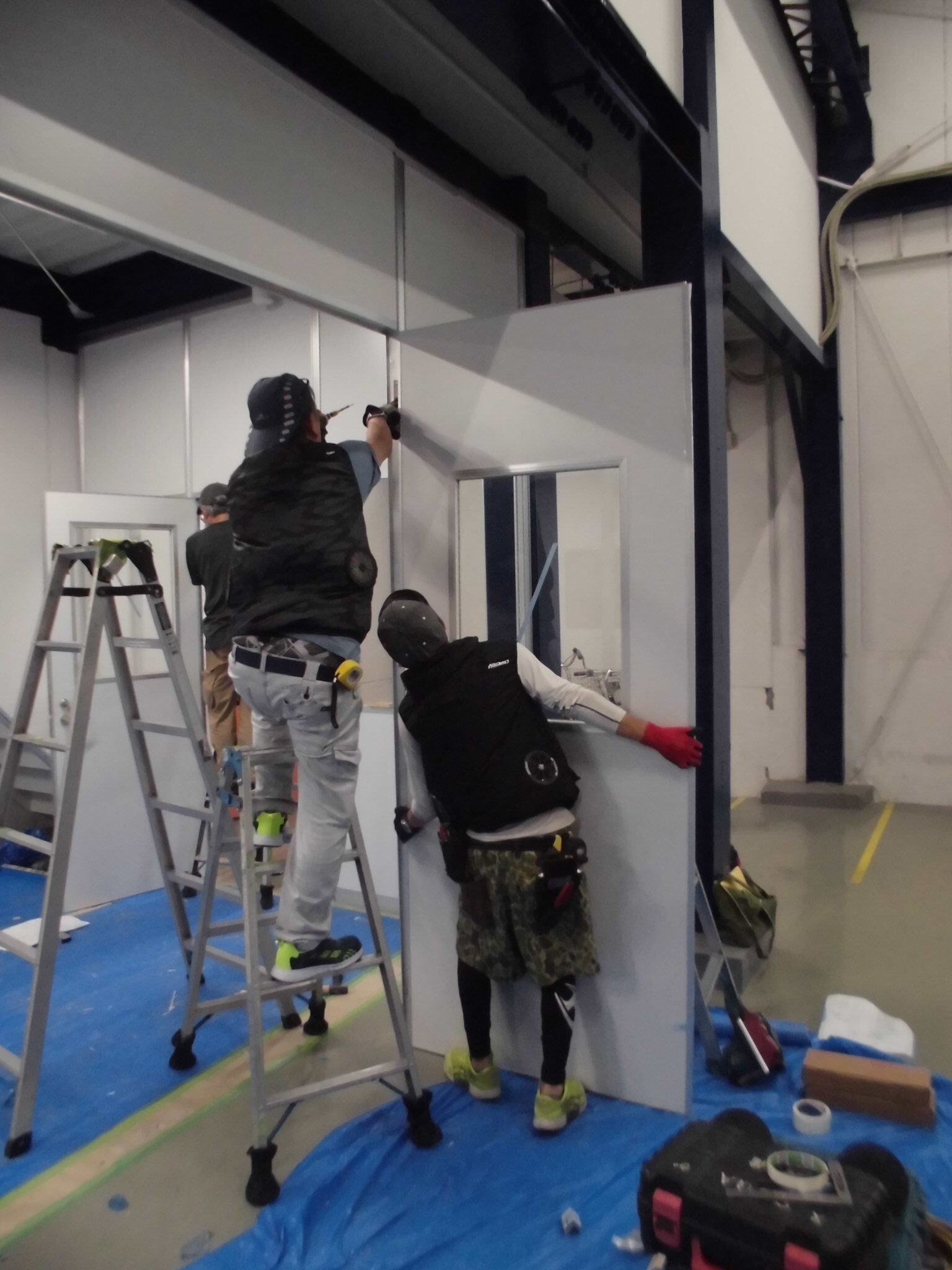 施工中⑦パネル設置用、ベースプレート、間仕切柱の取付が完了しましたら、壁パネルをはめ込んでいきます。