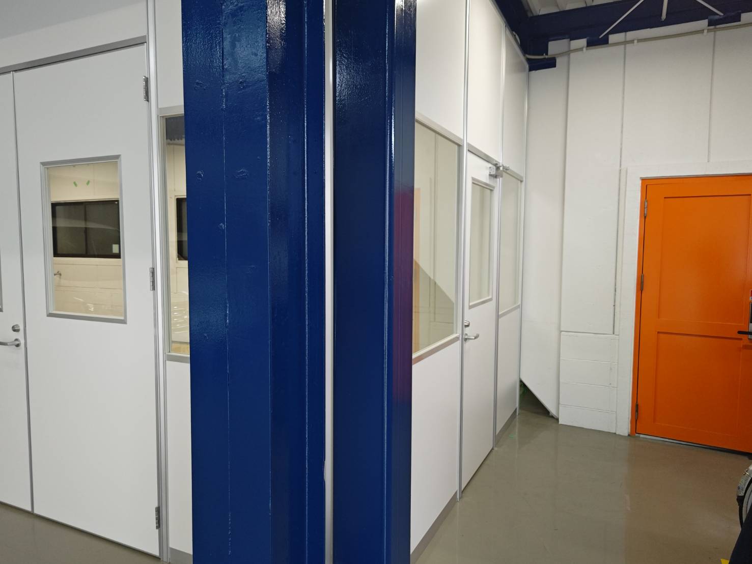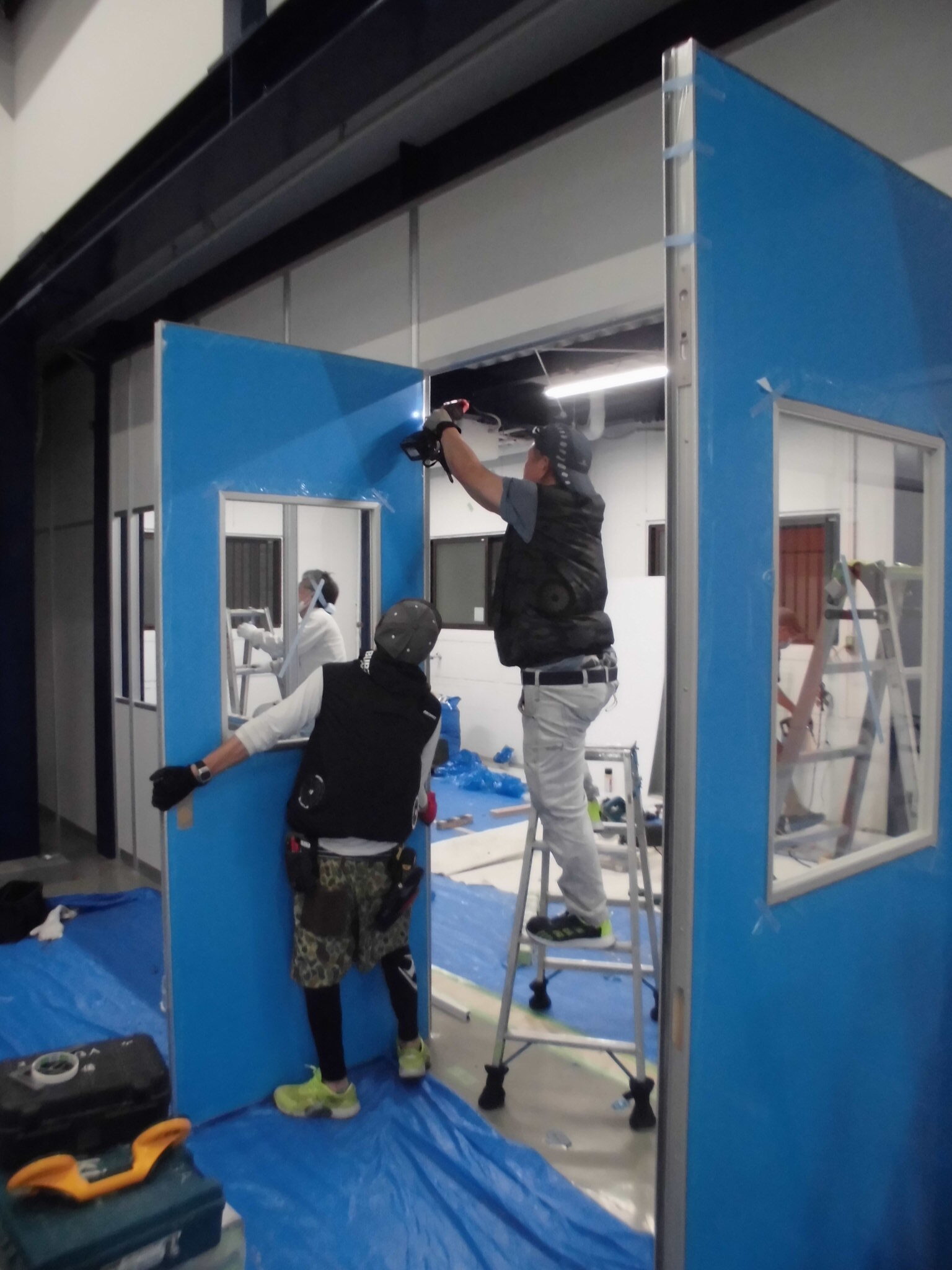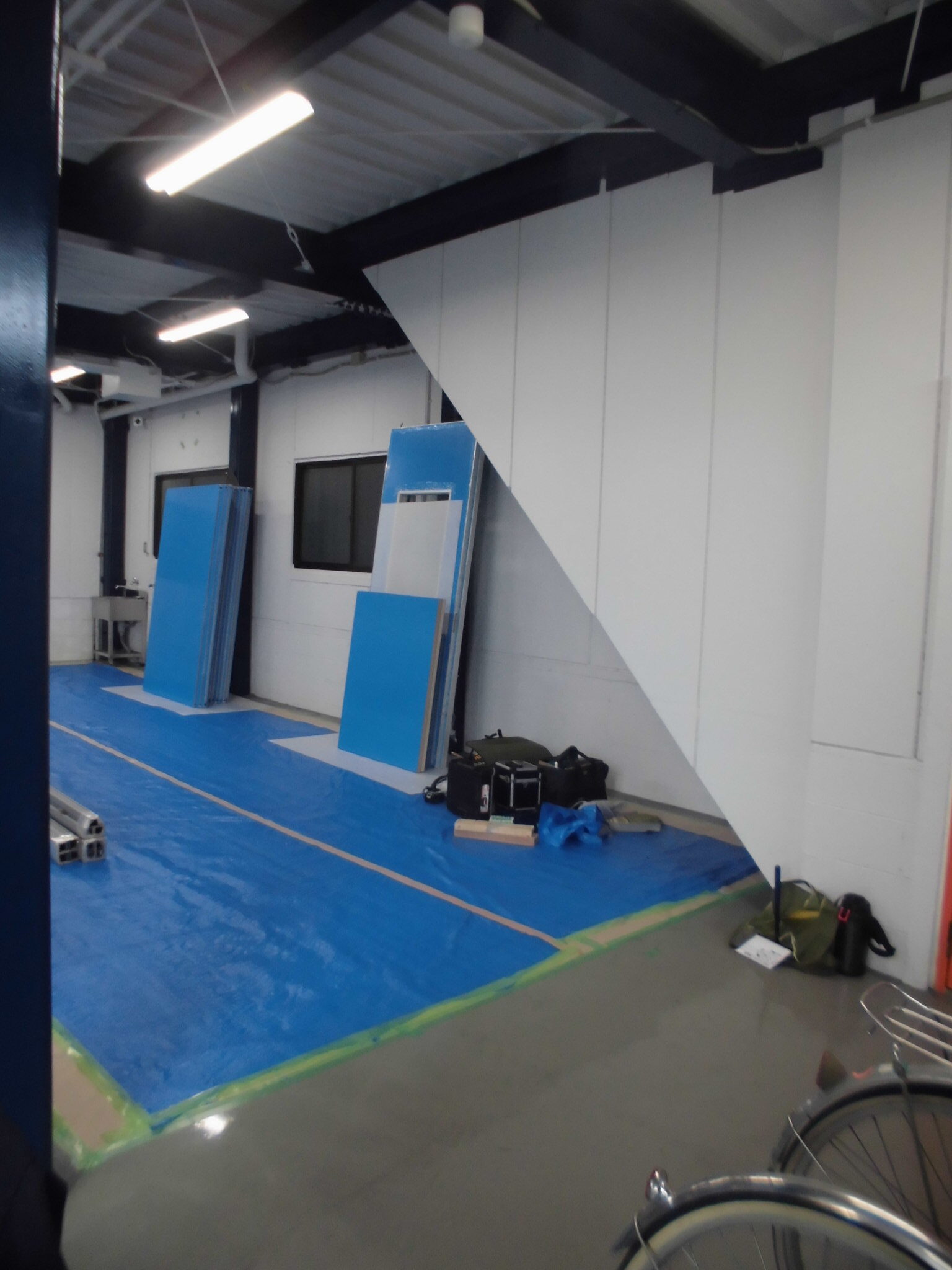 施工前①工場内空きスペースです。床の養生を敷きパーティション部材を搬入していきます。