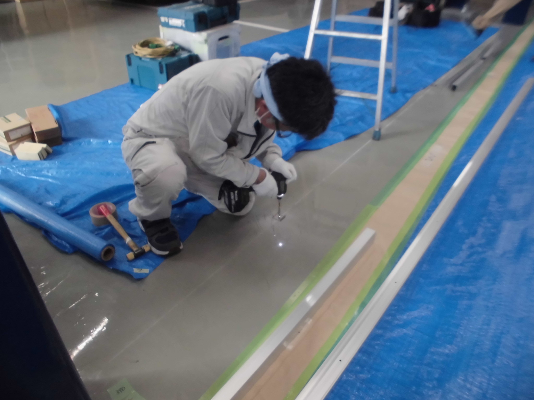 施工中①床にベース取付用金物を取り付けていきます。振動ドリルでコンクリートの床に穴をあけてプラグを仕込み、電動インパクトドライバーでビス止めしていきます。