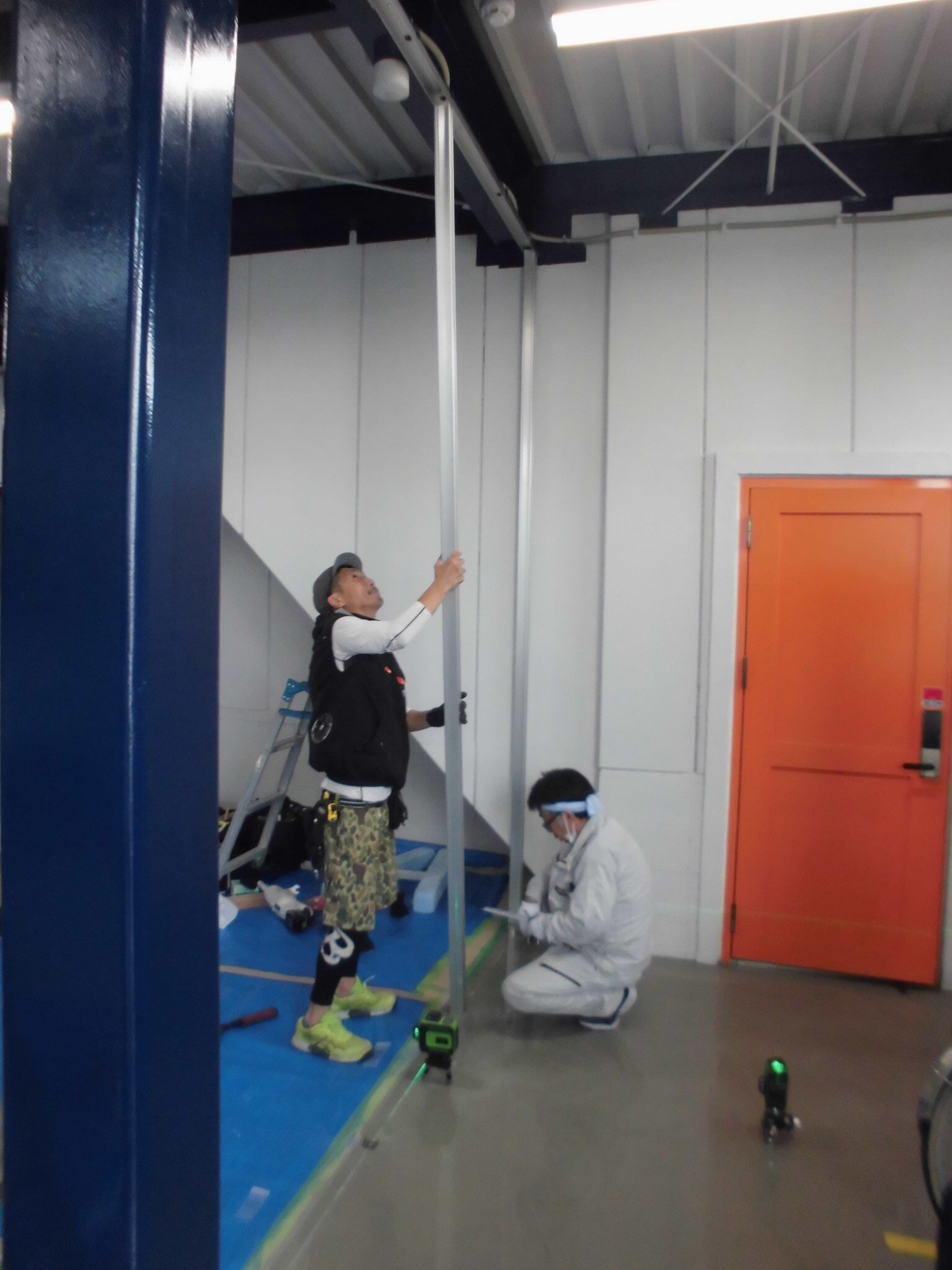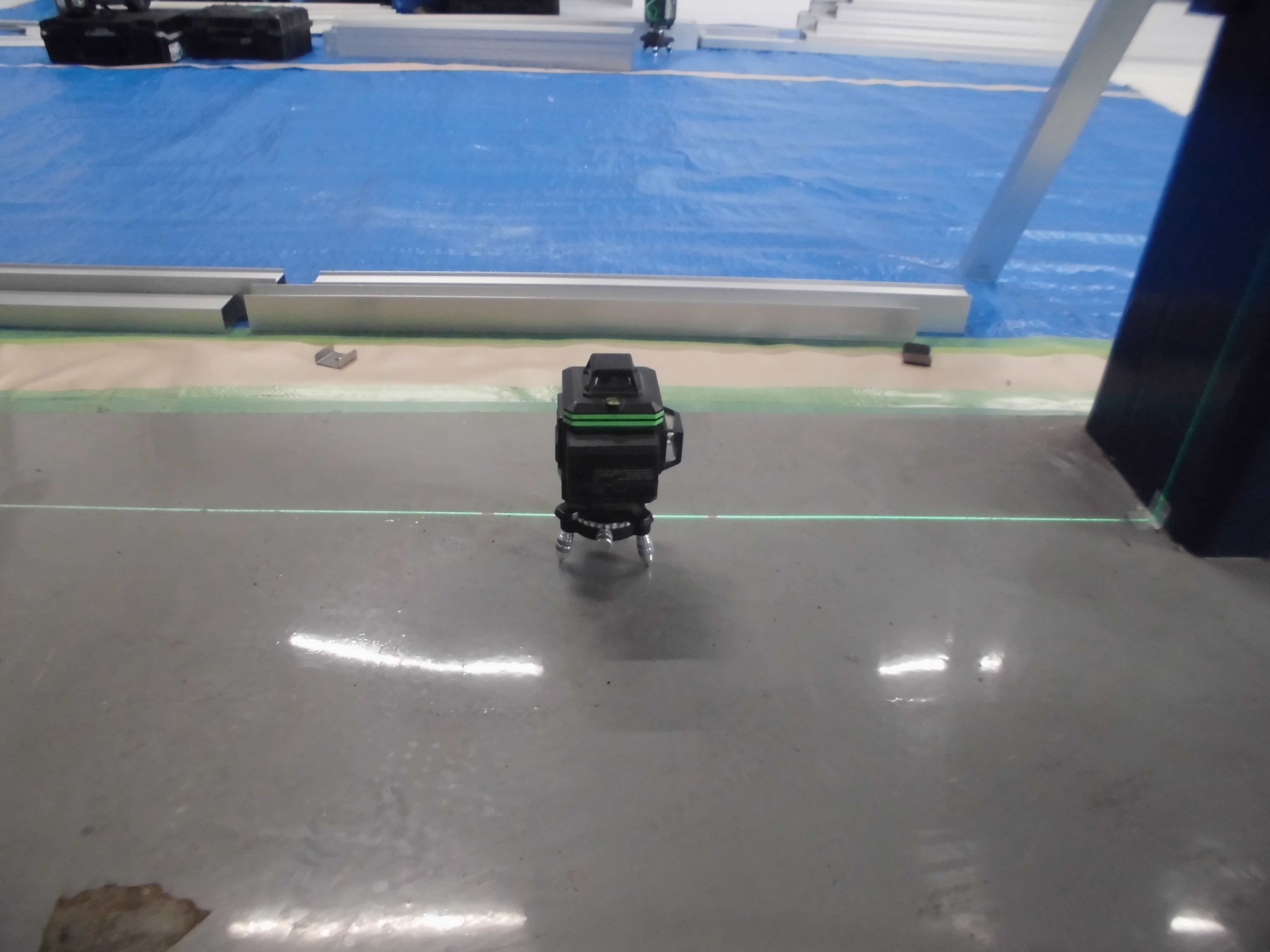 施工中②レーザー墨出し器を使用し床の高低差を計測しています。