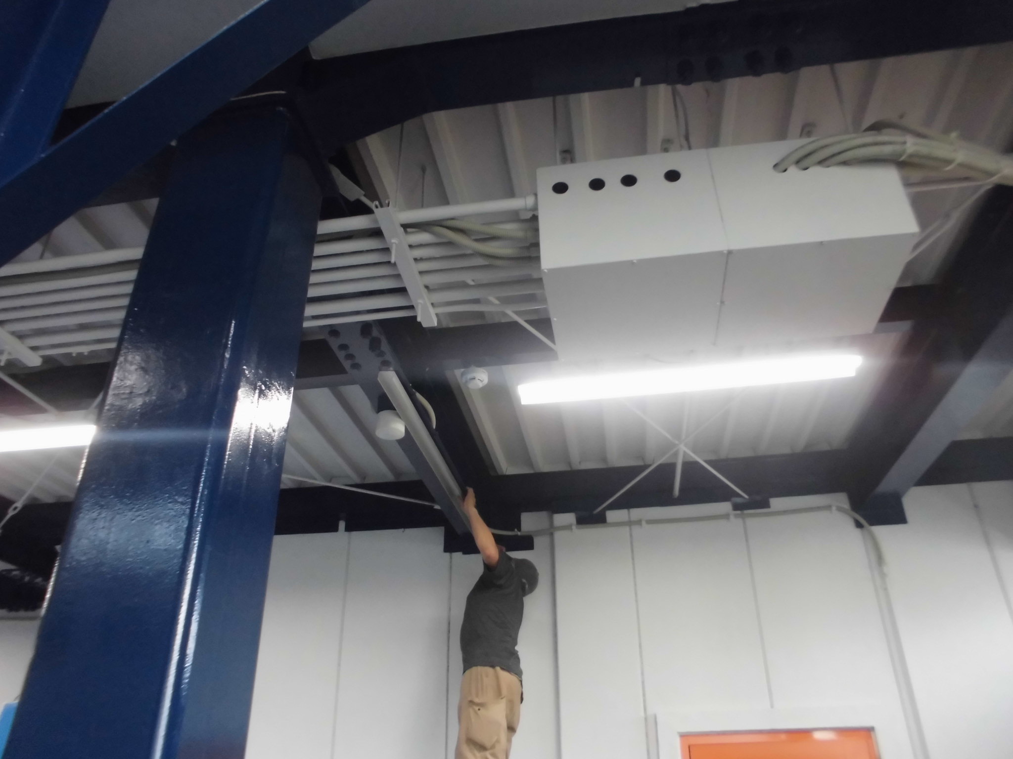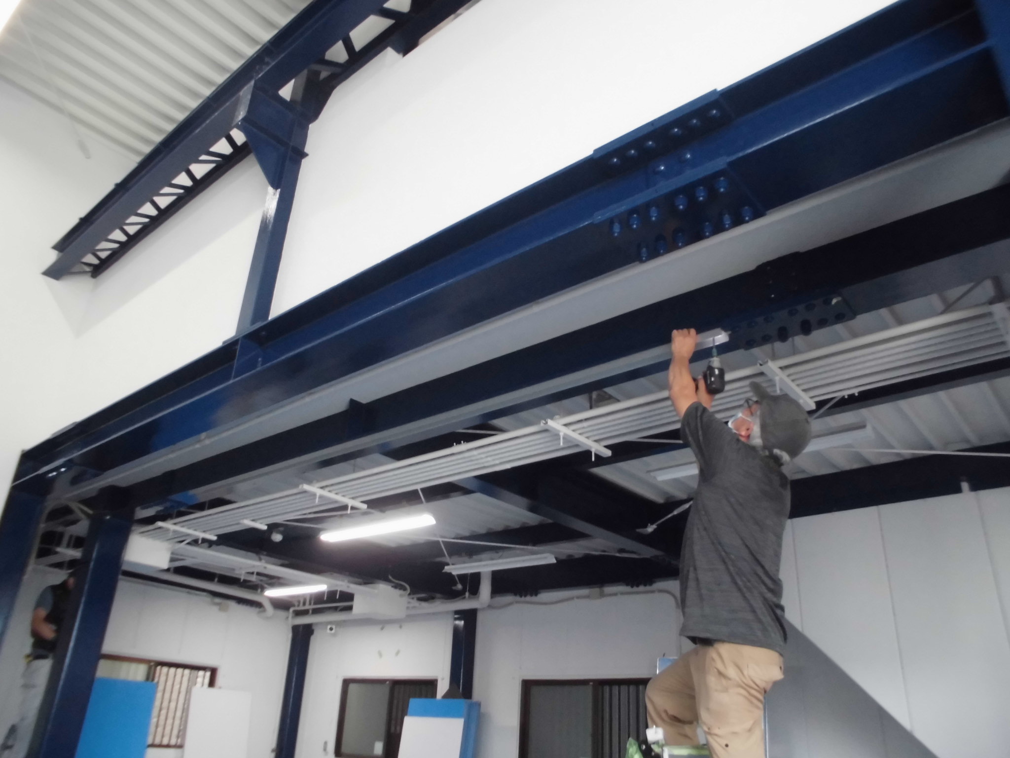 施工中④上部H鋼にベースプレート設置、ビス止めしていきます。